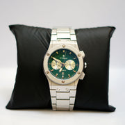 Experience bold sophistication with the TIMAS Chronograph watch featuring a stunning emerald green dial with dual subdials and gold accents. This premium timepiece combines sporty functionality with luxury design, making it the perfect statement piece for the modern gentleman who appreciates distinctive style.